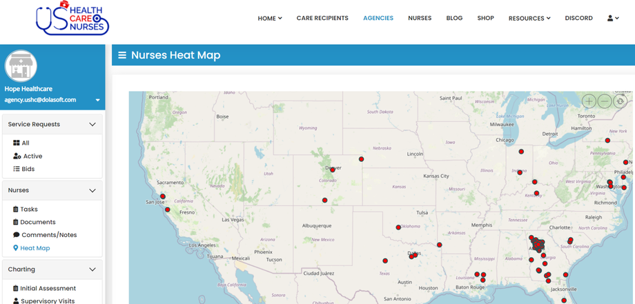 Nurses Heat Map One of the powerful features of this platform is the ability to display a heat map of where our registered nurses are, all over the United States.